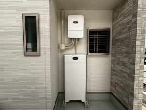 パワコン+蓄電池 外観完成|Huaweiパワコン(上)・蓄電池(下)が白い外壁にスッキリ設置