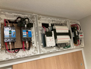 室内は分電盤(Panasonic 2台)とHuaweiエネルギーモニター3台を設置。動作確認を経てW様にお引き渡ししました。