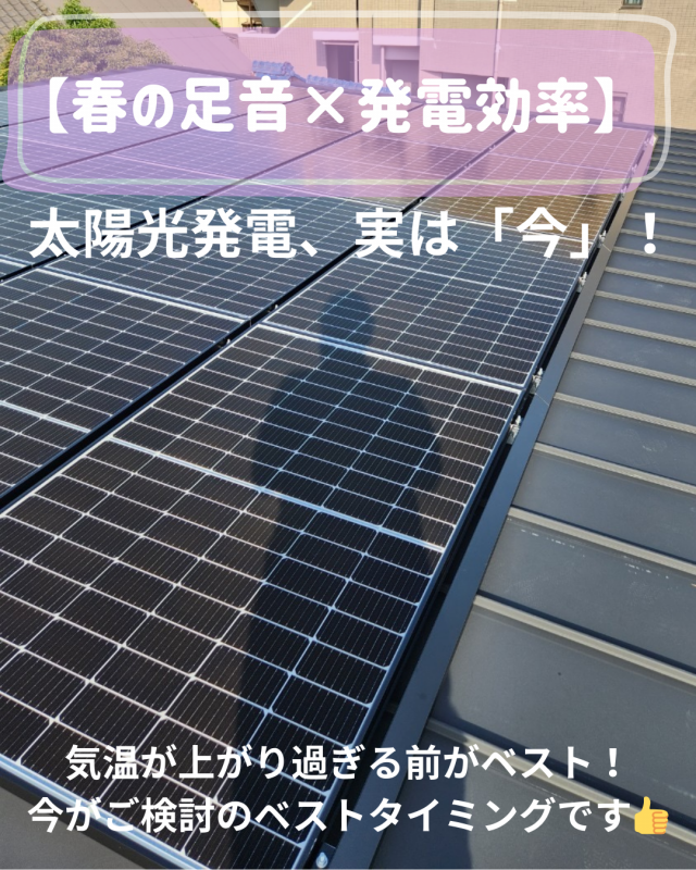 2026.02.10 ひとりごと 実は「今」が… 実は「今」が太陽光のベストシーズン目前! 2月に入り、少しずつ日が長くなってきましたね。実は太陽光パネルは、真夏よりも春(3月〜5月)が一番発電効率が良いってご存知でしたか? 太陽光パネルは熱に弱いため、気温が上がりすぎる前がベスト。今から設置検討を始めると、一番美味しいシーズンに間に合います! すこしでも気になったら株式会社SKY-Huにご連絡くださいね。 PDFを開く