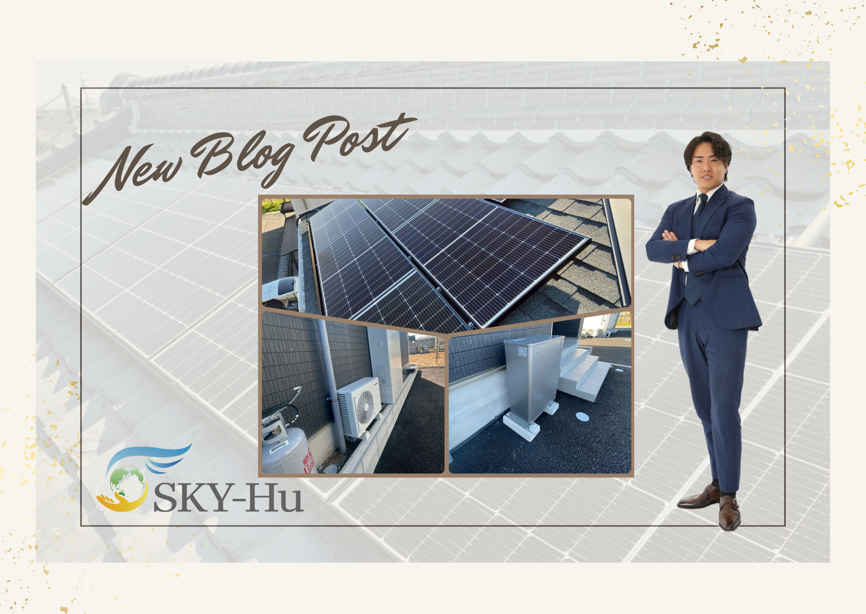 2026.03.04 ブログ 電気工事のプロが解説!太陽光発電の仕組みと導入メリット|SKY-Hu 「電気代が高くて毎月の支払いが不安…」「環境のためになにか行動したい」 そう感じている方に、ぜひ知っていただきたいのが太陽光発電です。 近年、電気料金の値上がりが家庭・企業にとって深刻な問題となっています。経済産業省のデータによると、電気料金は過去数年で大幅に上昇しており、家庭用電力の平均単価は2010年代と比べて30〜40%近く高い水準が続いています。そのような背景の中、注目を集めているのが「太陽光発電」の導入です。しかし、「太陽光発電って実際どういう仕組みなの?」「本当に電気代が安くなるの?」「初期費用はどのくらいかかる?」といった疑問をお持ちの方も多いのではないでしょうか。本記事では、電気工事のプロフェッショナルである株式会社SKY-Huが、太陽光発電の基本的な仕組みから導入メリット、費用の目安、補助金制度まで、わかりやすく徹底解説します。ぜひ最後までお読みください。 1. 太陽光発電とは?基本的な仕組みをわかりやすく解説1-1. 太陽光発電の基本的な仕組み太陽光発電とは、太陽の光エネルギーをソーラーパネル(太陽電池モジュール)によって電気エネルギーに変換するシステムです。難しそうに聞こえますが、仕組みはシンプルです。 ステップ内容① 太陽光を受光屋根や地上に設置されたソーラーパネルが太陽光を受け取る② 直流電力を生成パネル内の半導体(シリコン)が光エネルギーを直流電力に変換③ 交流電力に変換パワーコンディショナ(パワコン)が直流→家庭で使える交流に変換④ 電力を使用・売電自宅や事業所で消費し、余剰電力は電力会社へ売電(FIT制度) ソーラーパネルに使われる素材は主に「結晶シリコン系」と「薄膜系」に分類されます。現在市場に多く流通しているのは変換効率の高い結晶シリコン系です。パネル1枚あたりの出力は200〜400W程度で、住宅用では4kW〜10kW規模のシステムが多く採用されています。1-2. 太陽光発電の種類太陽光発電は設置場所・用途によって大きく3種類に分けられます。 太陽光発電の主な種類🏠 住宅用(10kW未満):一般家庭の屋根に設置。余剰電力をFIT制度で売電。🏭 産業用(10kW以上):工場・倉庫・商業施設の屋根や遊休地に設置。全量売電も可能。🌾 営農型(アグリボルタイク):農地の上にパネルを設置し、農業と発電を両立する新しい形態。 SKY-Huでは住宅用から産業用まで、幅広い規模の太陽光発電システムの設計・施工を承っております。 2. 太陽光発電を導入する5つの主要メリットメリット①:電気代を大幅に削減できる太陽光発電の最大のメリットは、日中に発電した電力を自宅や事業所でそのまま使用できることです。昼間の電力消費を自家消費に切り替えることで、電力会社から買う電気量を大幅に減らすことができます。 電気代削減シミュレーション例(住宅4kWシステムの場合)・年間発電量の目安:約4,000〜4,800kWh(地域・天候により変動)・電気料金単価を30円/kWhとすると:自家消費分で年間約6万〜7万円の電気代削減効果・売電収入(余剰分をFIT単価16円/kWhで売電):年間約1万〜2万円のプラス⇒ 合計で年間7万〜9万円程度の経済的メリットが見込める 蓄電池と組み合わせることで、夜間も自家発電した電力を活用できるため、さらなる電気代の削減が期待できます。メリット②:売電収入を得られる(FIT制度の活用)日本では「固定価格買取制度(FIT制度)」により、太陽光発電で生産した余剰電力を一定期間・一定価格で電力会社に買い取ってもらうことができます。住宅用(10kW未満)の場合、2025年度の売電単価は16円/kWh(※変動あり)で、10年間の固定買取期間が設けられています。FIT制度の認定を受けるには、事前に経済産業省への申請が必要です。SKY-Huでは、FIT申請の手続きサポートも含めてトータルでお手伝いしております。メリット③:CO2削減・環境への貢献太陽光発電は発電時にCO2を排出しないクリーンエネルギーです。一般的な4kWシステムで年間約1.5〜2トンのCO2削減効果があるとされています。これは杉の木約100本が1年間に吸収するCO2量に相当します。SKY-Huの企業理念「まごころ込めた技術で、お客様と地球の未来を照らす」にも込められているように、私たちは再生可能エネルギーの普及を通じて、持続可能な社会の実現に貢献しています。メリット④:災害・停電時のバックアップ電源になる近年、台風・地震・豪雨などの自然災害が多発しています。太陽光発電システムは、停電時でも「自立運転モード」に切り替えることで、日中に限り電力を使用することが可能です。さらに蓄電池を組み合わせれば、夜間の停電時にも電力を確保でき、冷蔵庫・照明・スマートフォン充電などの最低限の電力を維持することができます。近年は防災意識の高まりから、太陽光+蓄電池のセット導入が急増しています。メリット⑤:資産価値・企業価値の向上住宅に太陽光発電システムを設置することで、不動産の資産価値が向上するケ
