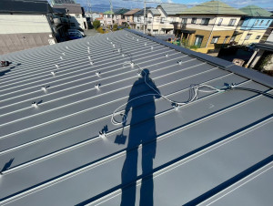 施工前の折板屋根全景。グレーの屋根材が青空の下に広がる。スタッフの影が屋根に長く伸びる。
