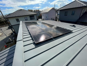 三重県津市のI様邸。折板屋根の上に、太陽光パネルが整然と並んでいます。