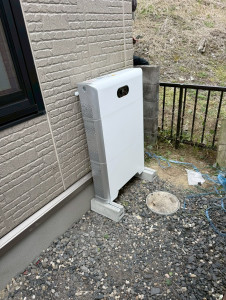 外壁にパワコン、その横の地面(砂利スペース)に蓄電池を縦型で設置しました 。
