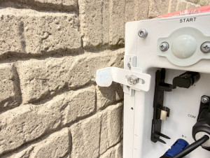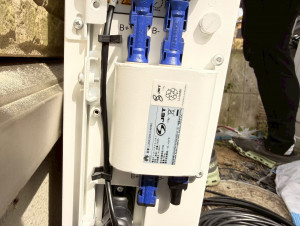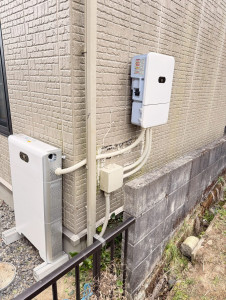 パワコン(壁面)+蓄電池(地面縦型)+接続ボックスの完成全景。スッキリとした仕上がり。