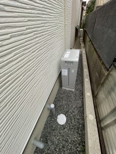 リチウムイオン電池・IP55防水対応で、屋外の砂利スペースに縦型設置しています